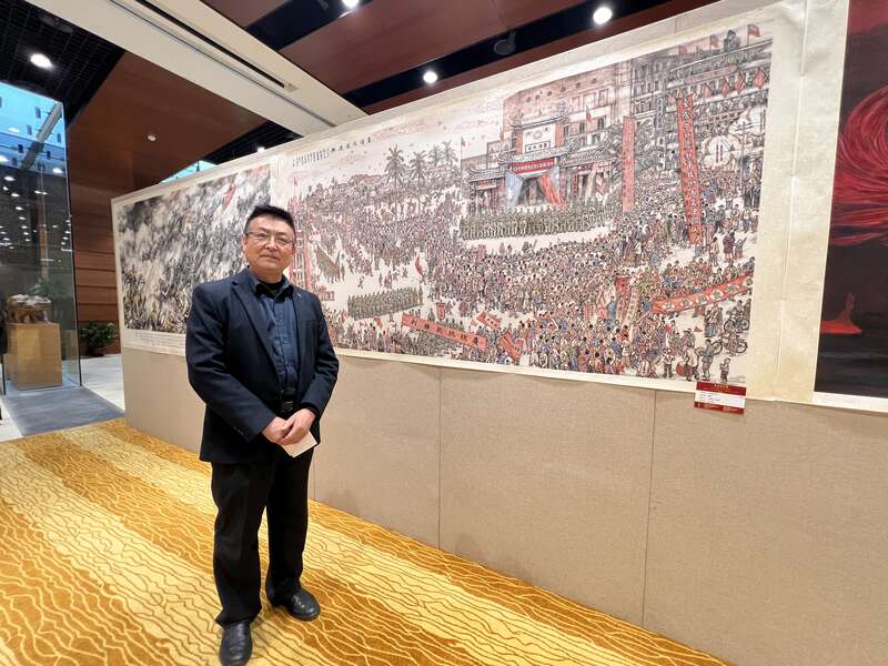 画家袁鹏飞与其作品《台湾光复庆典》合影。中青报·中青网记者 赵婷婷/摄