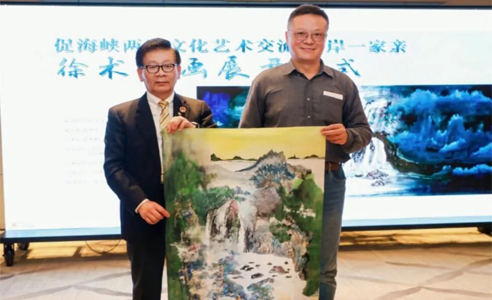 活动现场举行了作品捐赠环节。由徐术修先生之子徐乙泽先生代表徐老,向(中国台湾)中华民族振兴联合会、世界财神文化联合会捐赠徐术修先生精品画作一幅。这幅作品不仅是 一件艺术珍品,更承载着徐术修先生对两岸文化交流的殷切期望,以及两岸同胞对祖国统一的共同向往,成为两岸同心同源 的有力佐证。